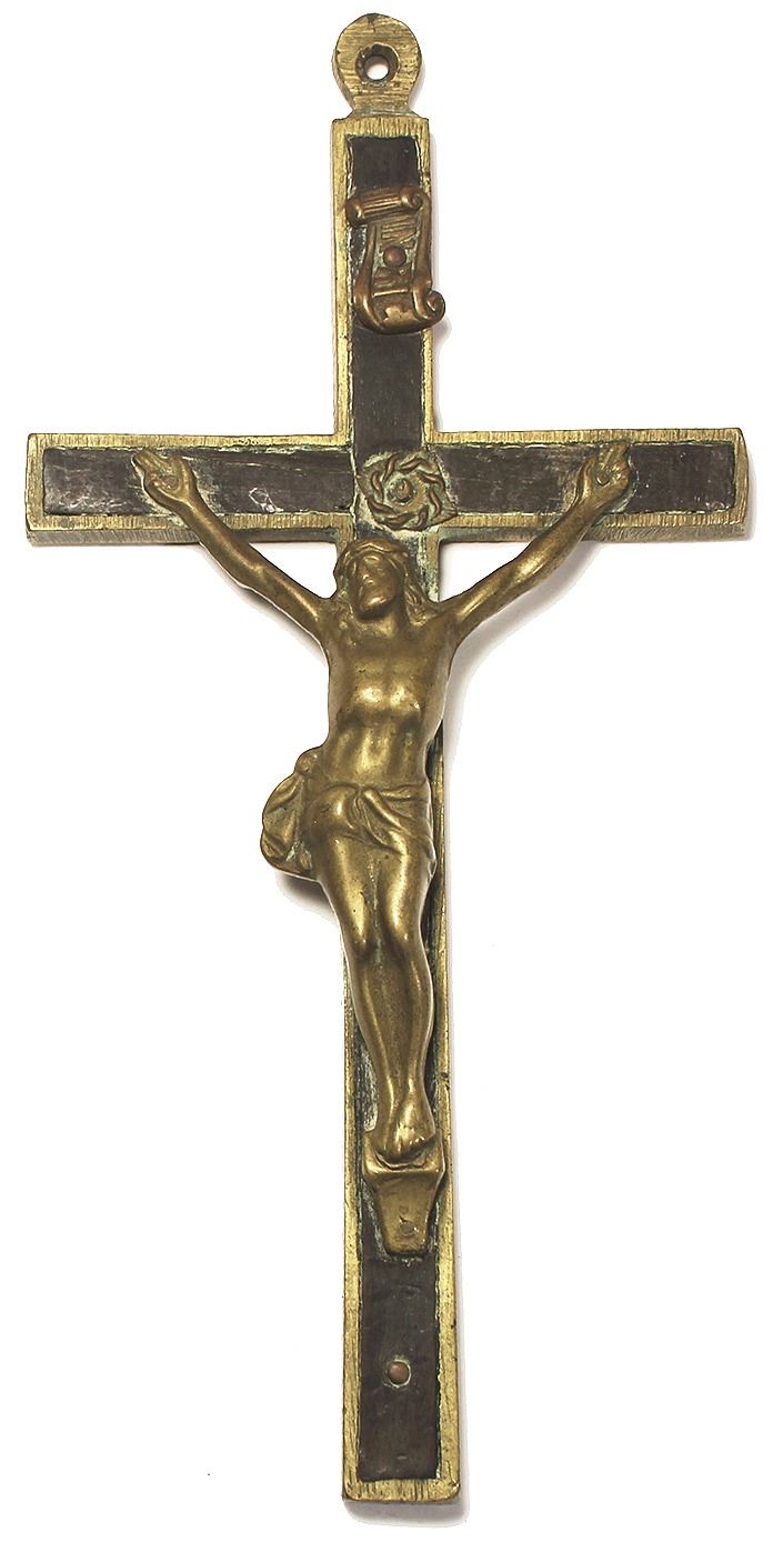 Spanish brass crucifix, 1800s. 100.82 grams and 6" x 3". Large, brass cross with ebony inlay in the cross, INRI in scroll at top and lacking skull-and-crossbones (Golgotha) at bottom.