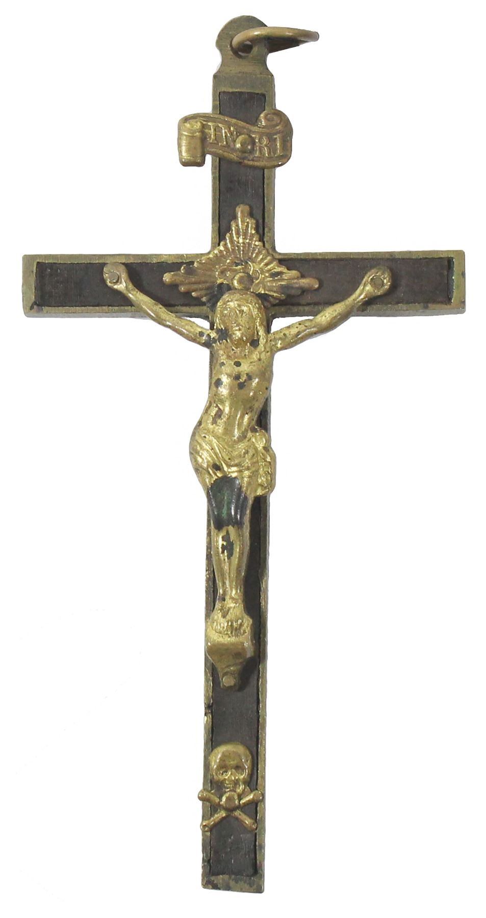 Spanish brass crucifix with black braided cord, 1800s. 55 grams, 5" x 2-1/2". Cast brass cross with "skull and crossbones" symbol (Golgotha) below Christ figure and INRI above, ebony wood insets, ring at top with black cord added later. With photo-certificate.