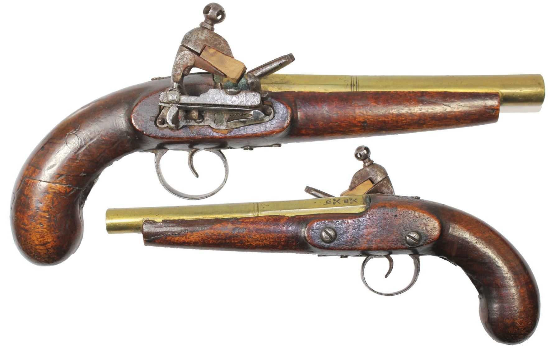 Spanish colonial Caribbean miquelet pistol, early 1800s. 774 grams, 13" long, 7-3/4" barrel, 3/4" muzzle. Locally made colonial piece utilizing a captured English officer's brass pistol barrel fitted with a Spanish miquelet lock and walnut stock with blacksmith-made iron mounts, the brass barrel with touch marks and stamped "London," the lock working and all in very good original condition. Pedigreed to our Auction #19, with original lot-tag #1709, and pedigreed to the Stuart Auerbach collection (see lot 4).