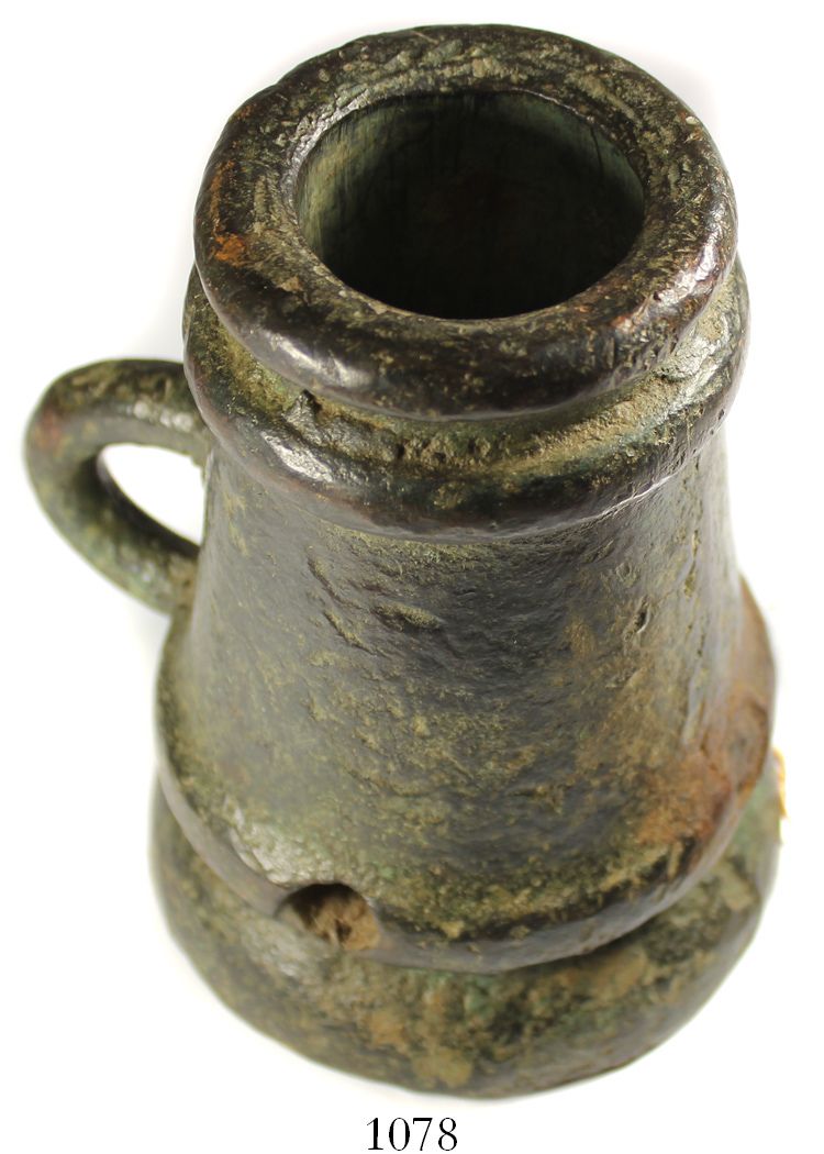 Spanish colonial bronze mortar, 1700s. 4 kg, 5-1/4" tall and 3-3/4" in diameter (base), 1-5/8" bore. Sometimes called a "thundermug," small flat-based cannons like this were used as powder-testers and signaling guns, this one probably made in Mexico City (where it was found), with reinforced band decorations (the lower one containing the touch-hole), small handle, nice dark patina with minor pits and dents and nicks from heavy use.