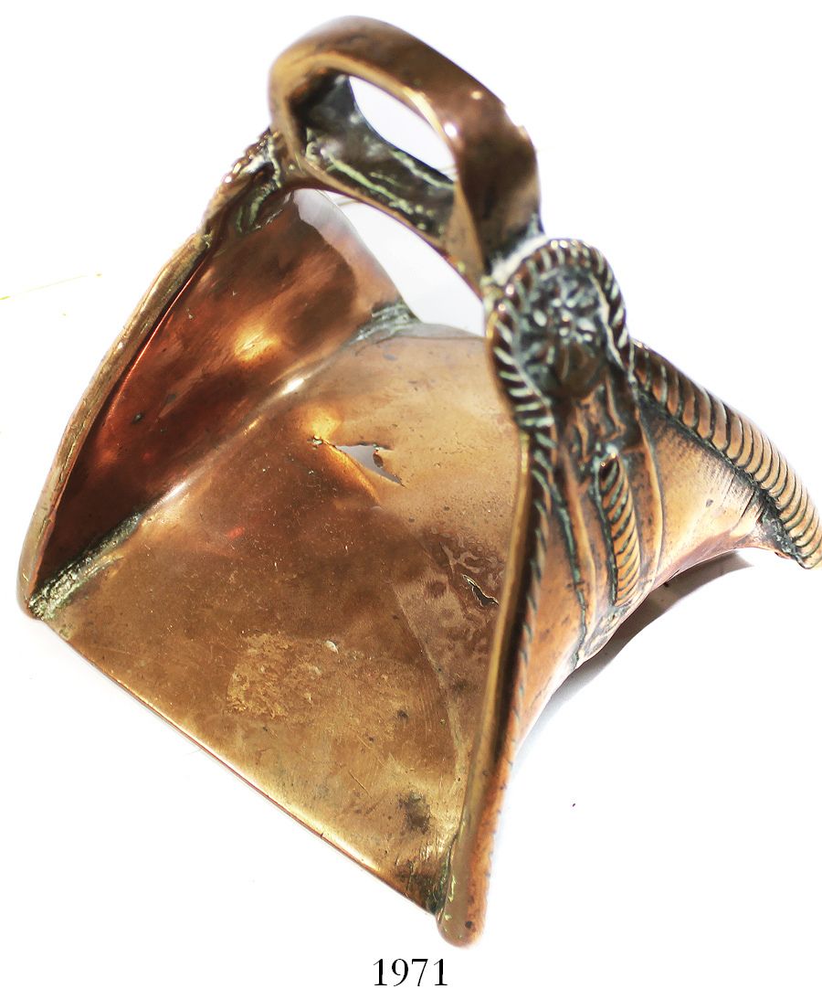 Spanish colonial bronze stirrup, 1600s, found in Peru. 743 grams; about 4-3/4" x 4-1/2" x 6". Bright bronze color (polished) with patina around details, small holes (as made?) in center, worn from use but intact. With photo-certificate.