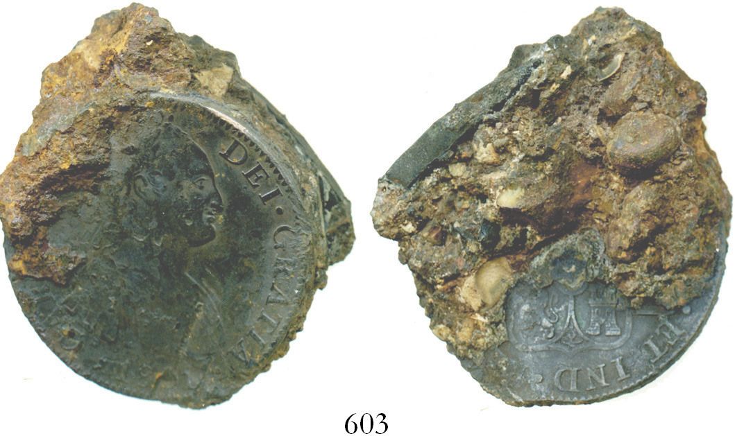 Spanish colonial bust 8 reales of Charles IV, dated 1801, in original crud (as found). 44.3 grams. Solid coin with bust-side out (slightly bent, darkly toned) on top of a wedge-shaped chunk of dark orange crud (impacted sediment), neat display. With certificate from the salvager (Stenuit). From the Athenienne, sunk in 1806 off Sicily in the Mediterranean