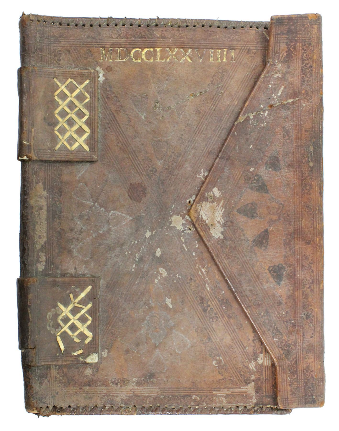 Spanish colonial leather dispatch case dated MDCCLXXVIIII (1779). 1071 grams, 13" x 17". Excellent condition despite a few chips in the leather, with original paper interior lining, the sides reinforced with leather stitching and the bottom with two large straps, the triangular opening mirroring an embossed design, but most striking feature is the embossed date highlighted in gold, undoubtedly rare and important. Pedigreed to our Auction #17 (lot #1550).
