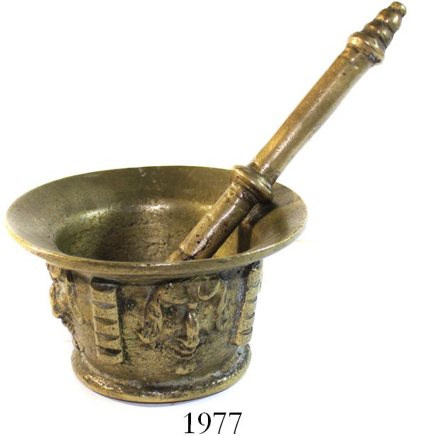Spanish colonial mortar and pestle, brass, 1600s. 1808 grams total, 3" tall and 5-1/4" in diameter (the pestle 8" long). Well used but intact, a perfect match in color and style, the exterior with 4 grotesque faces in panels., lightly encrusted. With photo-certificate.