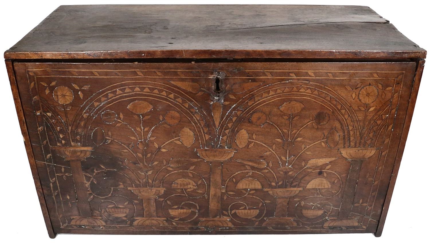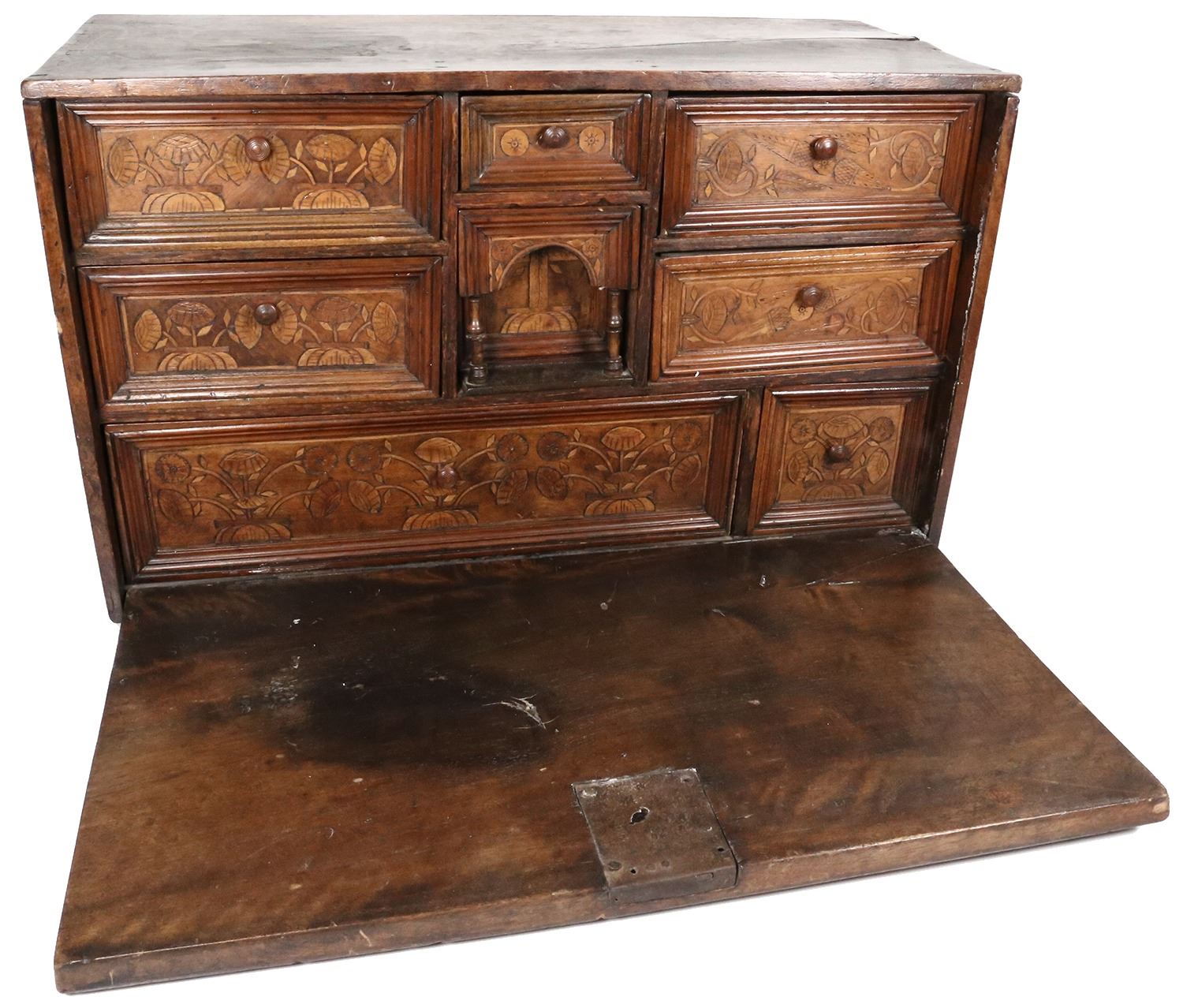 Spanish colonial "vargueno" or traveling desk/chest for table top, 1600s-1700s. 24-1/2" x 14" x 11". Well-loved walnut chest and portable desk with nine drawers of various sizes and shapes (a chapel-like drawer in the middle complete with cross), fall-front lid for writing, ornate inlaid decorations of potted flowers, all in good condition, including key to center lock (now frozen to plate and separated from chest). From a Florida estate and meant for a special place for display. (Special shipping applies; pickup in person recommended.) With photo-certificate