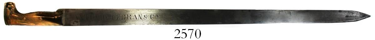 Spanish machete, ca. 1550-1600. 719 grams, 30-1/2" long. Impressively well-preserved blade boldly marked with ANTONIO FERRAN Y CA. on both sides, horn or tortoiseshell grip with a few chips, flat brass pommel.