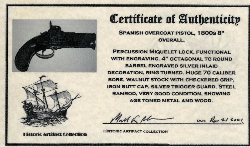 Spanish overcoat pistol, 1800s. 475 grams, 8-1/4" long, 3-3/4" barrel. Short, squat miquelet pistol with octagonal-to-round steel barrel, engraved silver inlaid decoration, ring-turned .70 caliber bore, walnut stock with checkered grip, iron butt cap, silver trigger guard, and steel ramrod, all in very good condition. With photo-certificate.