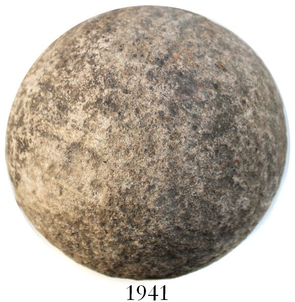Spanish stone roundshot (cannonball) from a 1588 Spanish Armada wreck in the straits of Dover off England, rare. 6 lb, 3.5 oz; 5" in diameter. Far less common than iron or even bronze cannonballs are the ones made of stone, typically in use in Europe in the 1300s-1400s (so this one is rather late) but undesirable for being too light, too hard to make and apt to break apart upon impact, which also accounts for their rarity now, this one very neatly formed out of green-gray rock, fully intact and also important for its pedigree. With photo-certificate.
