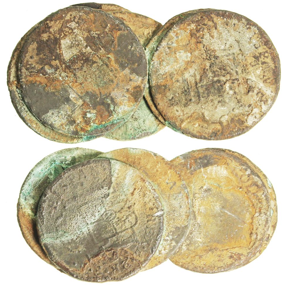 Spread-out clump of 6 Spanish colonial bust 2R of Charles III with encrustation all over (as found). 39 grams. Flat clump with solid, well-detailed coins underneath lots of orange and green encrustation. Recovered from: Cazador, sunk in 1784 off New Orleans in the Gulf of Mexico