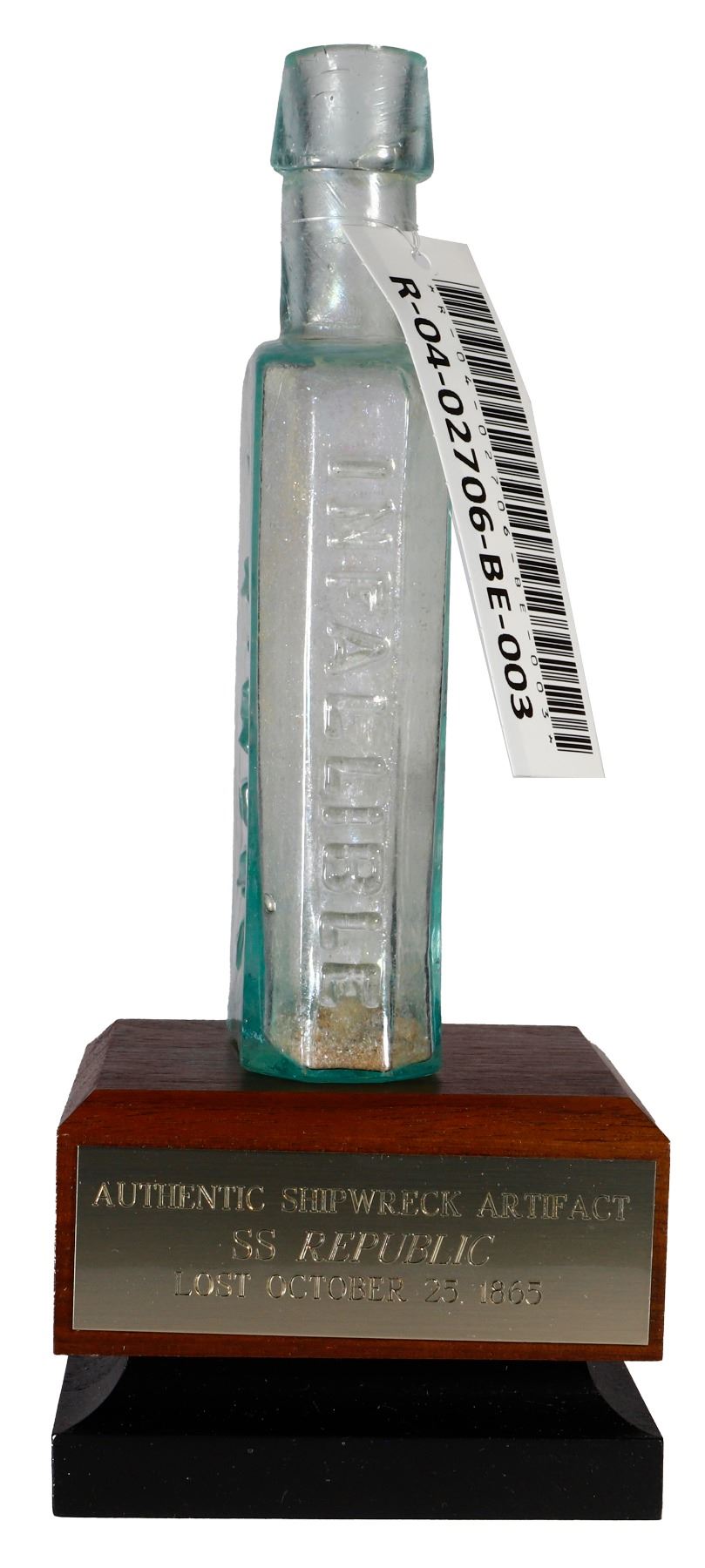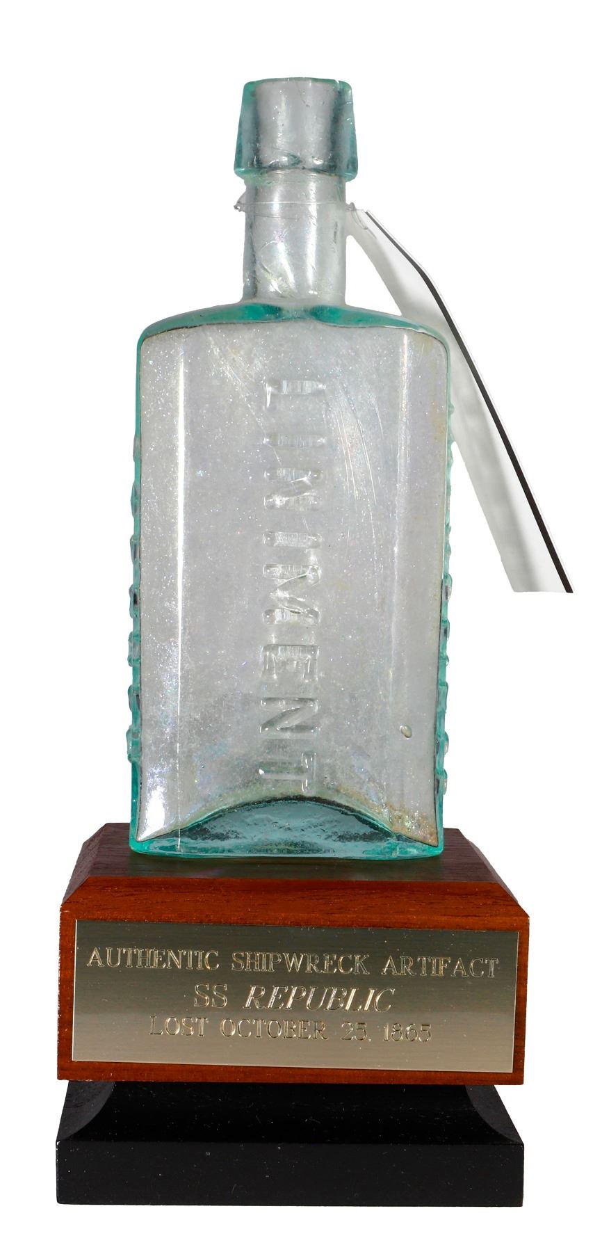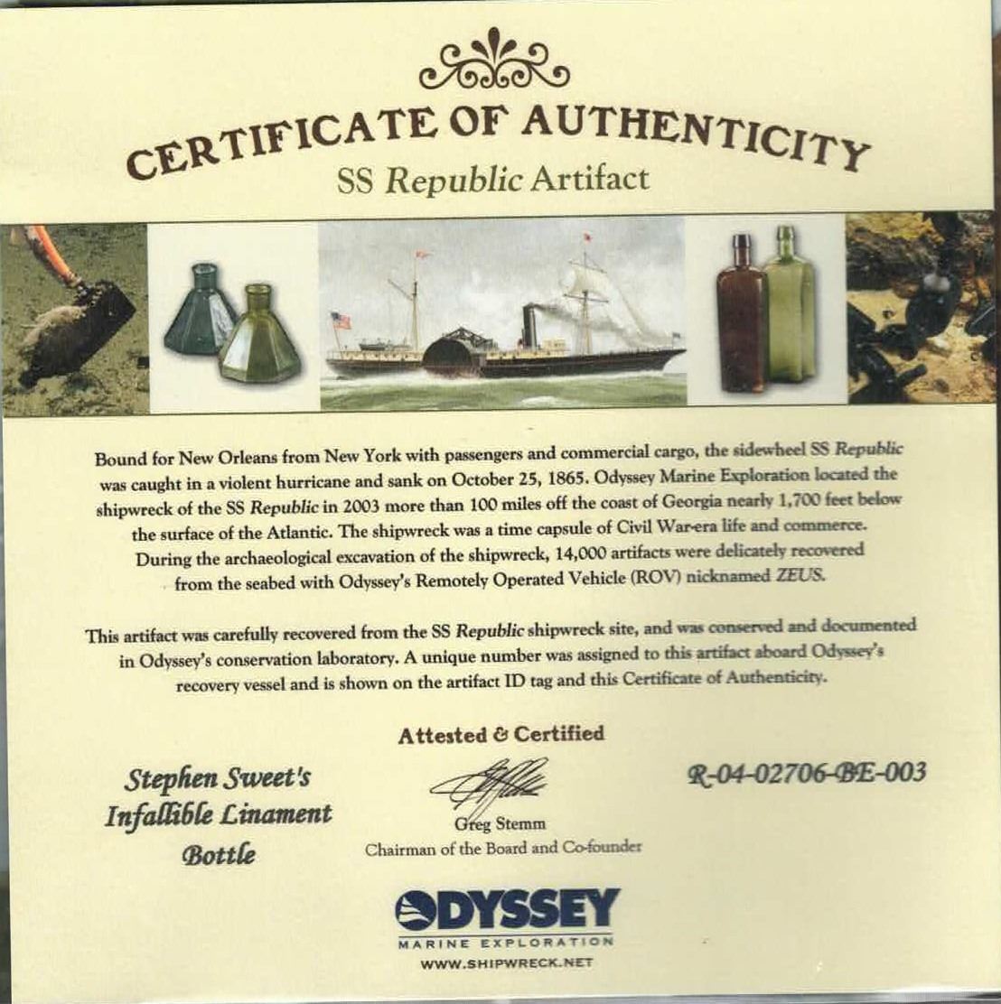 Stephen Sweet's infallible liniment glass bottle, with stand, ex-S.S. Republic (1865). 103 grams. 5" tall x 2" X 1". With STEPHEN SWEET'S INFALLIBLE LINIMENT imprinted on the sides of this small, light-green bottle, the remedy inside was for "rheumatism, gout, neuralgia, lumbago, stiff neck and joints, sprains, bruises, cuts and wounds, piles, headache and all rheumatic nervous disorders," in other words, for just about anything; intact with bits of sand in the bottom. From the S.S. Republic (1865), with original tag and certificate R-04-02706-BE-003 from the salvors.
