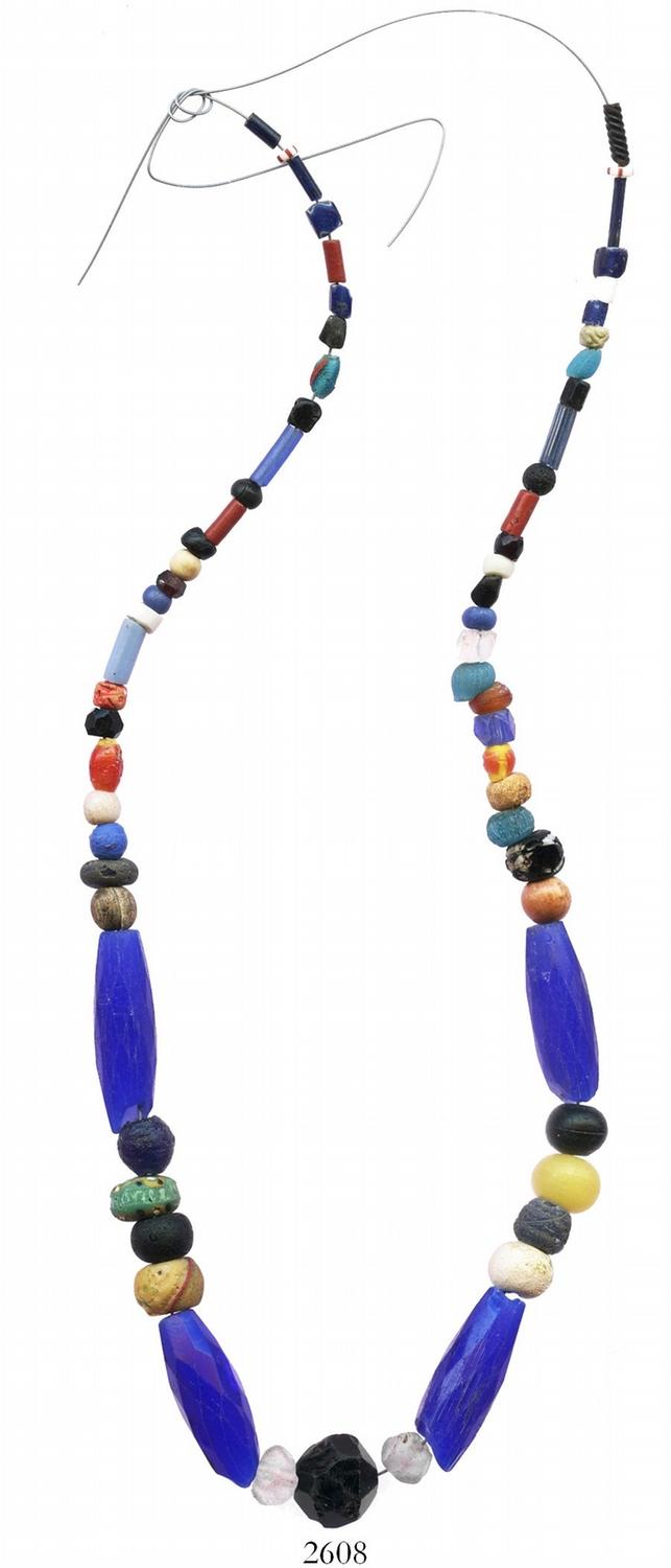 String of various beads, Spanish colonial (1600s). 68 grams, 22" long. Nice mix of different types of beads on a modern wire, consisting of royal-blue tubes, spheres of blue, pink, white, yellow, green and black, a couple rare crystals and some smaller cylinders. From a colonial site in the southern Caribbean.