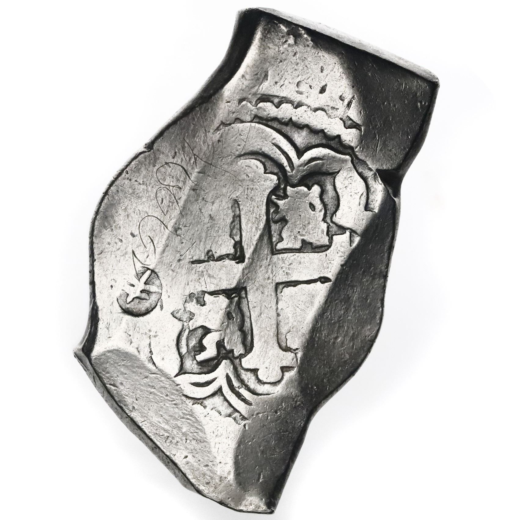 Sumenep (Madura Island), Indonesia, 1 real batu (1814), single chopmark and Malay script graffiti on reverse of a Mexico City, Mexico, cob 8 reales, Philip V, assayer not visible. Host: KM-47. 26.28 grams. Single circular chop next to contemporary writing scratched into the surface, irregularly shaped planchet with partial shield and cross.