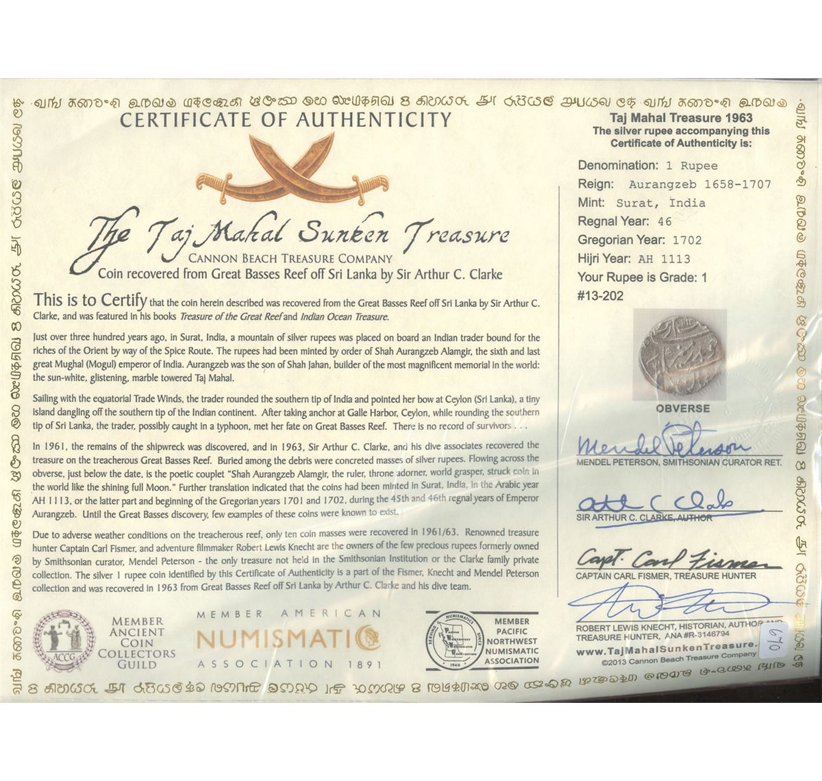 Surat, India (Mughal Empire), 1 rupee, Aurangzeb (1658-1707), AH1113 (1702), Grade 1. 11.3 grams. UNC with just a hint of surface corrosion, choice specimen from a salvage that famously involved the late author Arthur C. Clarke. With DVD and photo-certificate #13-202 from the salvagers. Recovered from: "Taj Mahal treasure," sunk ca. 1702 off Sri Lanka