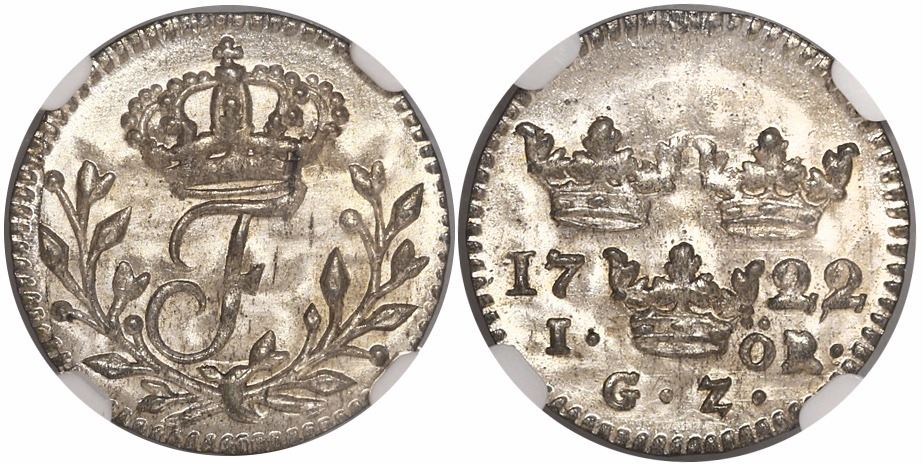 Sweden, 1 ore, 1722GZ, Fredrik I, encapsulated NGC MS 67, finest known in NGC census (for date and type). Bold strike, highly lustrous and devoid of wear or marks, totally superb for the type, for which this is the single highest-graded specimen at NGC (and the only one for this date).