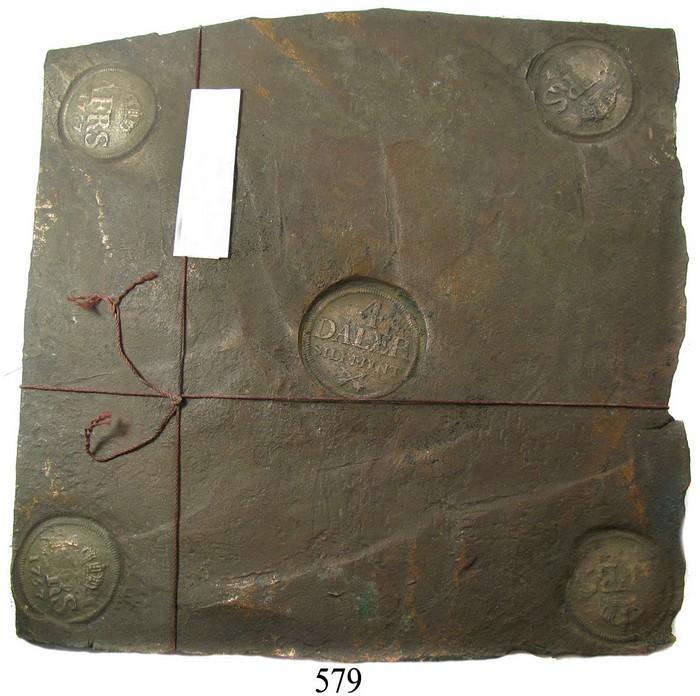 Sweden (Avesta mint), copper "plate money" 4 dalers, Adolf Frederick, 1757. KM-PM76. 2621 grams, about 10" square. Rather large and perfectly square "coin" with 5 clear stamps, the one in the middle with denomination and mintmark (SILF MYNT and crossed-arrows) and the 4 in the corners with crowned monogram AFRS and 1757 date, all details clear and nearly corrosion-free. Recovered from: Count Ernst Schimmelmann, sunk in 1781 off the Cape Verde Islands, west of Africa. With Arqueonautas certificate #MAI-010/99/20256.