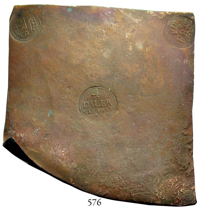 Sweden (Avesta mint), copper "plate money" 4 dalers, Fredrik I, 1729. KM-PM74. 2484 grams, 9-1/2" x 9". Large square "coin" with 5 stamps, the center one with denomination above mint and 3 of the corners with crowned king's monogram above date all bold but one of the corners corroded, a separate corner very much bent upward. With Arqueonautas certificate #MAI-010/99/CN/20459. Recovered from: Count Ernst Schimmelmann, sunk in 1781 off the Cape Verde Islands, west of Africa