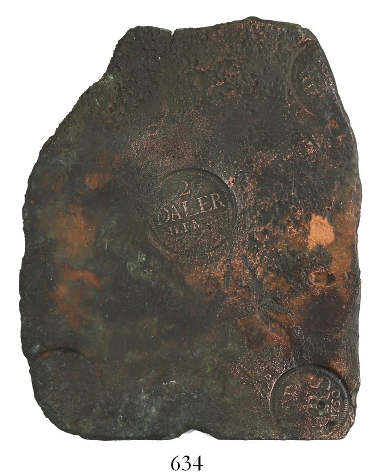 Sweden, copper 2 daler "plate money," Fredrik I, 1750. KM-PM71. 1050 grams, 7-3/4" x 6-1/2". Truncated from corrosion (one whole corner lost and some of three edges) but with central stamp and one corner stamp full and clear, deeply toned. With original (generic) certificate from the salvagers. Recovered from: Nicobar, sunk in 1783 off South Africa