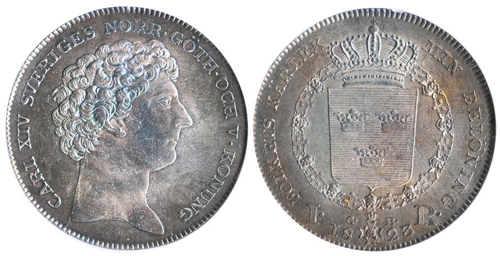 Sweden, riksdaler, Carl XIV Johan, 1823CB, encapsulated NGC AU 58, tied for finest known specimen graded by NGC. KM-593. Beautiful light toning that is rosy gold in color on reverse and bluish on obverse, with much underlying luster, high catalog value.