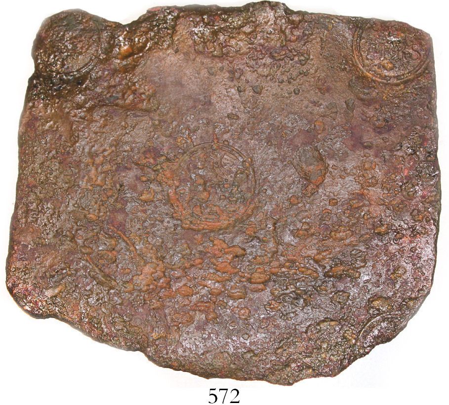Swedish copper "plate money" 4 daler, Fredrik I, 1726. KM-PM74. 1774 grams, 9-1/2" x 9". Somewhat corroded, with the edges a bit ragged, but with bold stamps that are just barely legible enough to see the king's name, denomination and date, typical brown color with lighter "paste" in crevices. With certificate. From the Nicobar, sunk in 1783 off South Africa