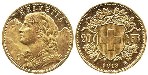 Switzerland, 20 francs, 1913-B. KM-35.1. 6.4 grams. Frosty Mint State, almost prooflike, no problems.