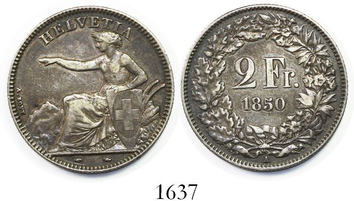 Switzerland (Confederation), 2 francs, 1850-A. KM-10 9.89 grams. Attractively toned XF, no problems.