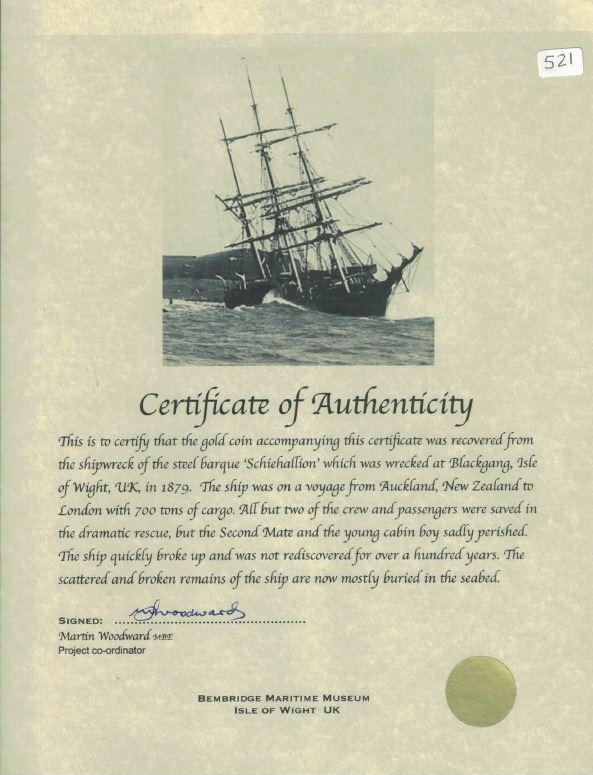 Sydney, Australia (under Great Britain), gold half sovereign, Victoria (young bust), 1861. KM-3. 3.97 grams. XF with light colorful toning on reverse, tiny marks from immersion, rare type. With certificate from the salvager. Recovered from: Schiehallion, sunk in 1879 off the Isle of Wight, south of England