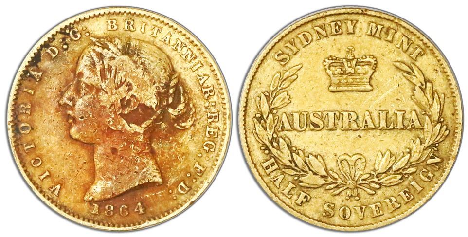 Sydney, Australia (under Great Britain), gold half sovereign, Victoria (young bust), 1864. KM-3. 3.93 grams. VF/XF with heavy red toning on obverse, rare type. With certificate from the salvager. Recovered from: Schiehallion, sunk in 1879 off the Isle of Wight, south of England