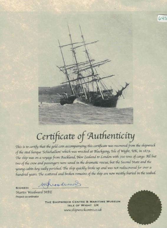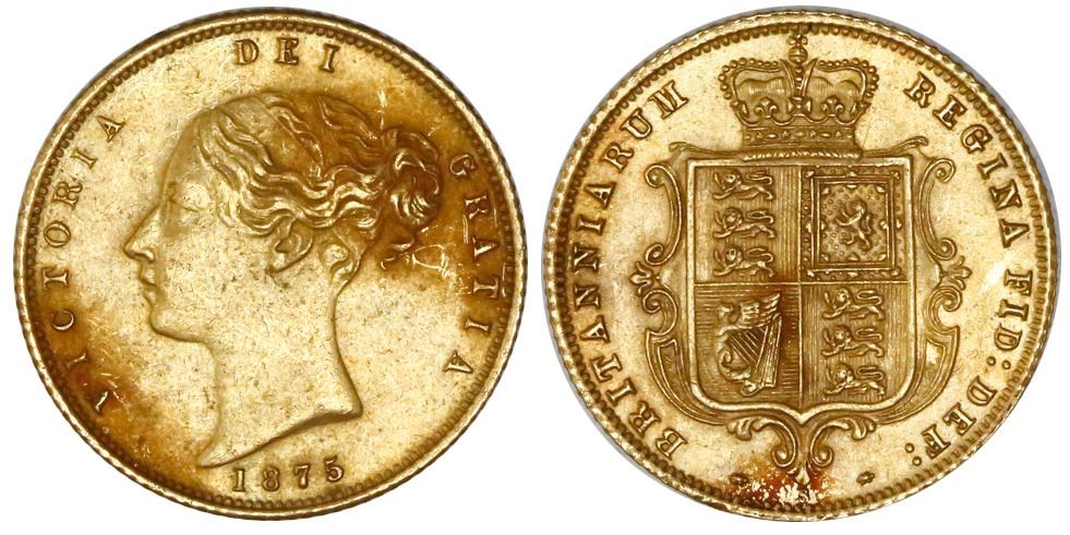 Sydney, Australia (under Great Britain), gold half sovereign, Victoria (young bust), 1875-S, arms reverse, rare type. Sp-3862B; KM-5. 3.99 grams. Choice AU with minimal marks, muted luster and light patches of red-orange encrustation, numismatically rare but also a scarce wreck. With certificate from the salvager. Recovered from: Schiehallion, sunk in 1879 off the Isle of Wight, south of England