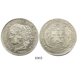 1003 - Ayacucho, Peru, 5 pesetas, 1882LM, M below wreath.Sedwick & Associates, LLC