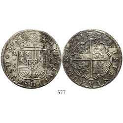 Seville, Spain, milled 8 reales, Philip V, 1733PA. CT-945; KM-358. 25.88 grams. Choice AU with minimal surface corrosion, deep toning all over, scarce