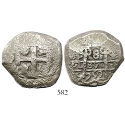 Potosi, Bolivia, cob 8 reales, 1752q. S-P52; KM-40 ;CT-364. 24.44 grams. Full pillars with bold date, nearly full cross with partial second date below