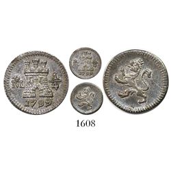 Mexico City, Mexico, 1/4 real, Charles IV, 1799/8. KM-62; CT-1398. 0.83 gram. Lustrous Mint State with blue toning, virtually flawless.