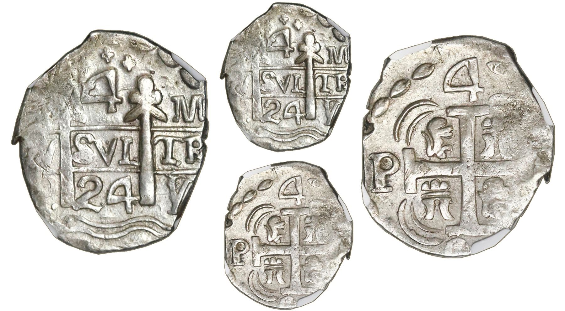 Tegucigalpa, Honduras, provisional "imitation cob" 4 reales, 1824-(P)MPY, with quadrants of cross transposed and backwards lions, NGC MS 62, finest known in NGC census, ex-Richard Stuart (stated on label). KM-16.2. 8.95 grams. Lustrous and choice, with full pillars-and-waves (one pillar very bold) with full date and M and Y, full but off-center cross with bold P to left, minor crudeness near edge but otherwise pristine and exceptional. Pedigreed to the Richard Stuart collection. NGC #4465081-004.