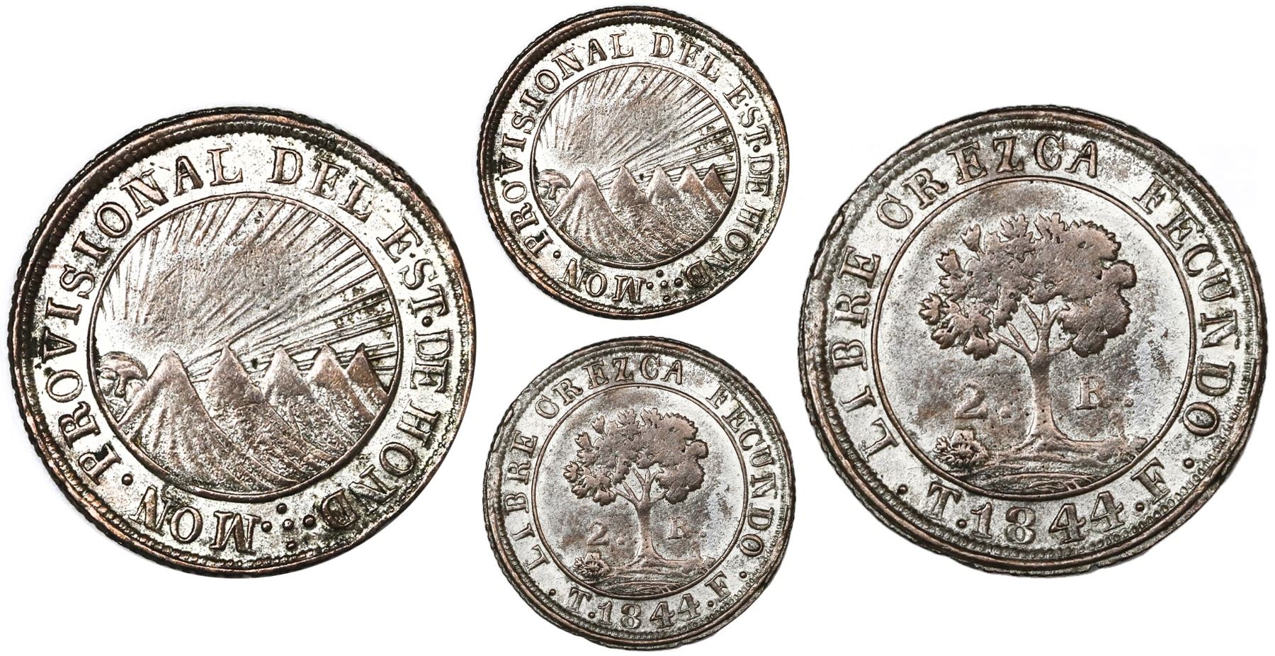 Tegucigalpa, Honduras, provisional (low-silver) 2 reales, 1844F, CREZCA variety, NGC AU details / cleaned, ex-O'Brien. KM-19a. Sharp details (the leaves somewhat flat), with lots of luster on silvery fields, light rosy copper color on high points (a bit bright, but arguably not egregious enough to call "cleaned"), scarce assayer. NGC #4771567-014. Pedigreed to the John O'Brien collection (stated on label).