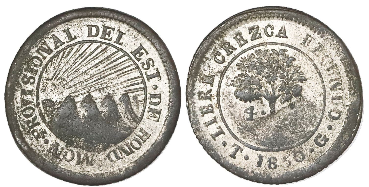 Tegucigalpa, Honduras, provisional (low-silver) 4 reales, 1850G, narrow date variety, NGC VF 30, ex-O'Brien. KM-20. Choice dark details contrasted by pewter-colored fields, all legends and leaves of tree particularly well defined, with typical area of weakness above date but overall quite attractive for the type and grade. NGC #4771567-018. Pedigreed to the John O'Brien collection (stated on label).