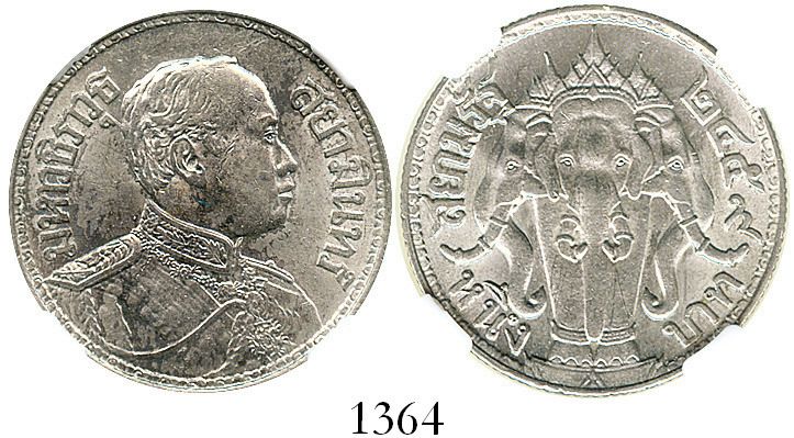 Thailand, 1 baht, BE2459 (1916), encapsulated NGC AU 58. KM-Y45. Bold and lustrous, with spot of colorful toning in center of obverse only.