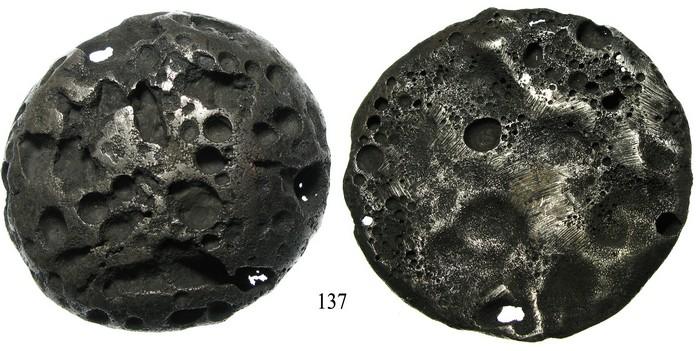Thick silver contraband disk, 96.25% fineness (estimated), from the 1733 Fleet. 1037 grams, 4" in diameter and ¾" thick. An evenly-formed dome of silver with significant bubble-holes on the bottom, completely unmarked (hence contraband), its fineness estimated from an assay done on another ingot found at the same time in the same place, nice dark silver color with some minor scuffing on the flat side exposing bright silver under the surface. From the Capitana El Rubí of the 1733 Fleet, pedigreed to our Treasure Auction #1 (lot #53).