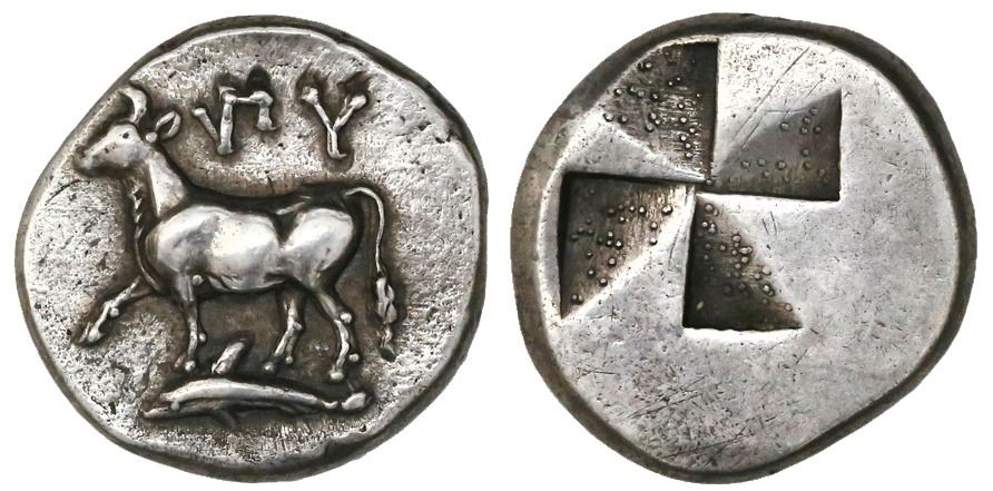 Thrace, Byzantium, AR siglos, 340-320 BC. SNG BMC Black Sea 21ff. 5.31 grams. Bull standing left on dolphin / Incuse granulated mill-sail pattern. Bold AVF with nice toning, the incuse off-center.