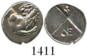 Thrace, Cherronesos, AR hemidrachm, ca. 400-350 BC. BMC Thrace 41; McClean 4114. 2.4 grams. Forepart of lion right, head reverted / Quadripartite incuse; •VE monogram and bee in opposing quarters. Lustrous AU with very light toning, nice lion.