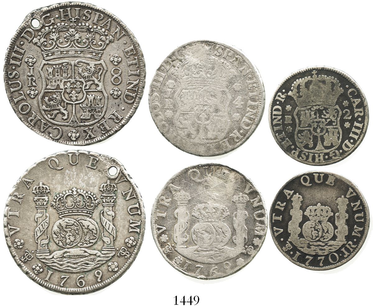 Three-coin denomination set of Potosi, Bolivia, pillars of Charles III: 8R 1769JR; 4R 1769JR; and 2R 1770JR. 45.9 grams total. The 8R is a nicely toned XF with hole at edge; the 4R is a lightly toned Fine with scratches; the 2R is choice Fine+ with deep toning.