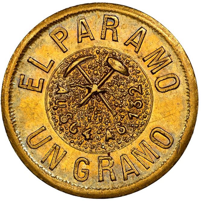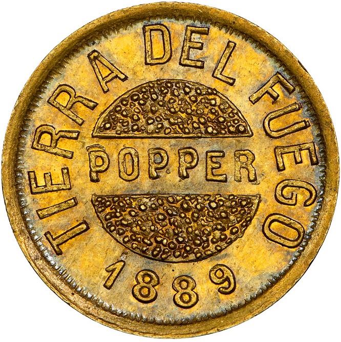 Tierra del Fuego (struck in Buenos Aires), Argentina, gold 1 gramo, Popper, 1889, large letters, NGC MS 62. Janson-7; KM-Tn5. Ample luster with traces of light rainbow toning, a one-year type (highly sought by numismatists) struck by Romanian-Jewish gold-prospector Julius Popper using gold dust found on the beach of El Paramo in the Patagonian peninsula. Popper's expedition, under the name of Gold-Washing Company of the South (Lavaderos de Oro del Sud), achieved a sort of autonomy, with its own army and coins and stamps, as well as a notorious "wild west" atmosphere replete with crime and abuse of natives. Popper died suddenly and mysteriously in 1893.