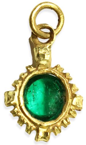 Tiny but ornate gold pendant with high-quality cabochon emerald (approx. 1/2 carat). 0.3 gram, 10mm. This was probably part of something bigger (like an earring), as it is of exceptional quality for its size, the emerald quite translucent and deep green, with glossy surfaces (open on both sides), held in place by 4 prongs in an oval setting with ribbed sides, loop and jump-ring at top, no damage at all, very rare as the only piece of jewelry ever offered for sale from this wreck, which did not yield many artifacts in the first place. Recovered from: Capitana, sunk in 1654 off Chanduy, Ecuador
