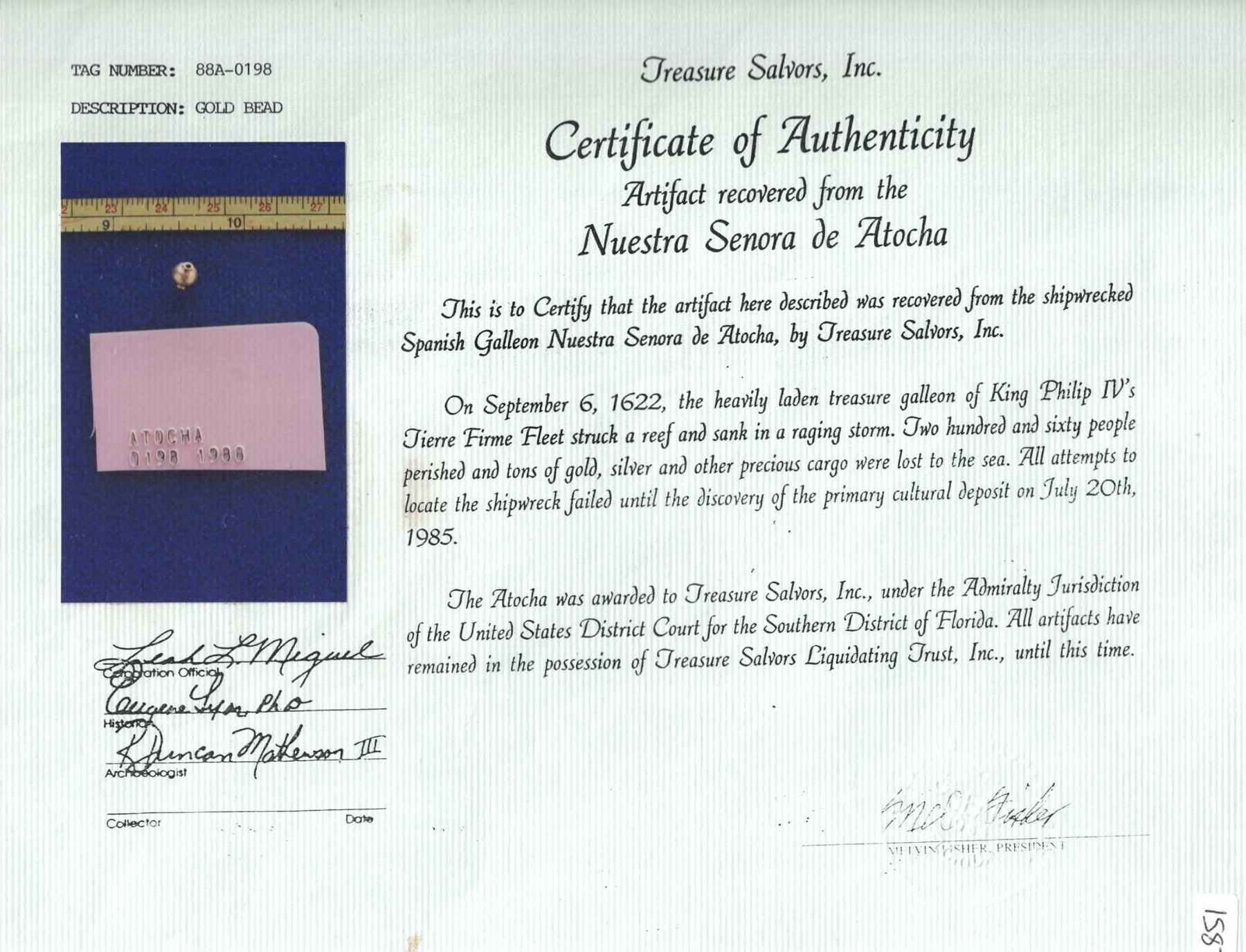 Tiny gold bead, 0.16 gram, ex-Atocha (1622), ex-Lippman. Roughly ¼" diameter. Dainty bead, surely originally part of a larger piece of jewelry, with small hole on each end for stringing, the outside smooth and round with a central seam. From the Atocha (1622), with original Fisher plastic tag and photo-certificate 88A-0198, and pedigreed to the Noel Lippman Collection.