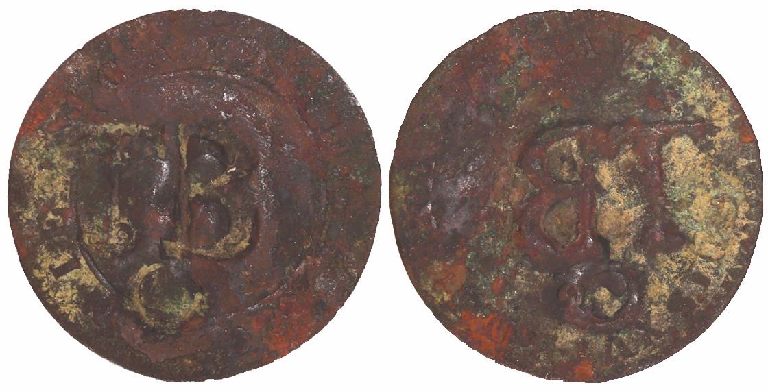 Tobago (British administration) 1-1/2 pence ("black dogg"), TB/o countermark (1798) on a French Guiana billon 2 sous (1780-90). 1.36 grams. Host VG at best, with gray-green crust on most of it, the countermark deep and bold.