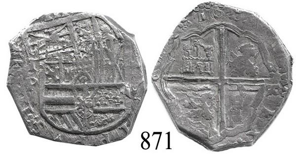 Toledo, Spain, cob 4 reales, 1622P, scarce. CT-606. 13.3 grams. Full and well-detailed but double-struck shield and cross, full date, oT-P to left, much of king's name in legend, lustrous XF.