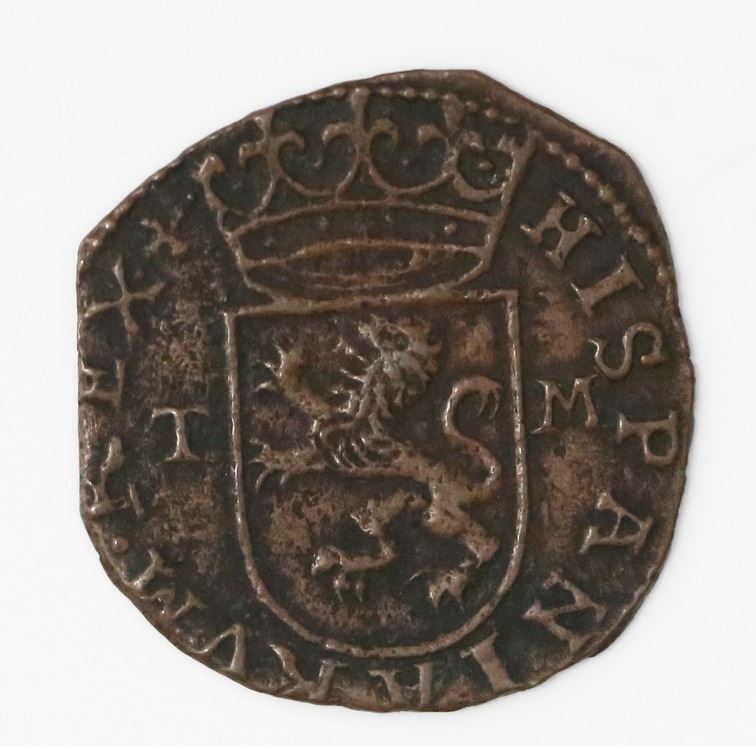Toledo, Spain, copper cuartillo, Philip II, assayer M to right and mintmark T to left on both obvers