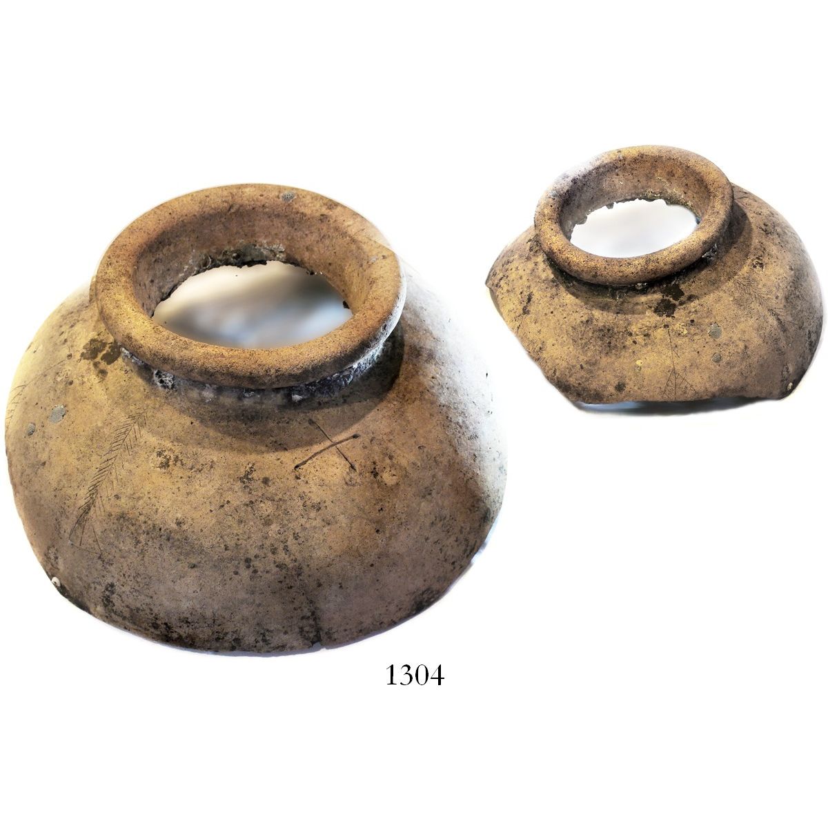 Top (lip and shoulders) of an immense earthenware urn, with markings. 48 lb, 26" in diameter and 11" tall. This has to be the biggest "olive jar" we have ever seen, with an opening at top large enough (11" diameter) to receive practically anything that needed storing on board the ship, everything below the shoulder of the jar typically missing (probably broken into thousands of pieces) but what is there shows curious markings (one X and two arrow-like emblems) that referred to merchants and/or owners, some hairline fractures but apparently stable and (if nothing else) held together by a thick coating of greenish gray coral encrustation inside, a very impressive display indeed. (Fragile--pickup only.) Pedigreed to the Marty Meylach collection. Recovered from:Maravillas, sunk in 1656 off Grand Bahama Island