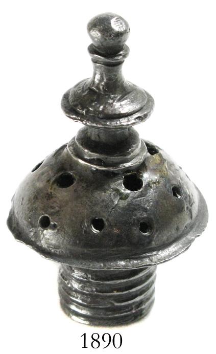 Top of a silver sand or salt cellar. 17.8 grams, 1-7/8" long. Minaret-like round finial with screw base and holes in sides, intact except for a few minor corrosion holes, very cute, identical to ones found on the Atocha (1622). Recovered from: 1681 Fleet off Panama (Boticaria site).