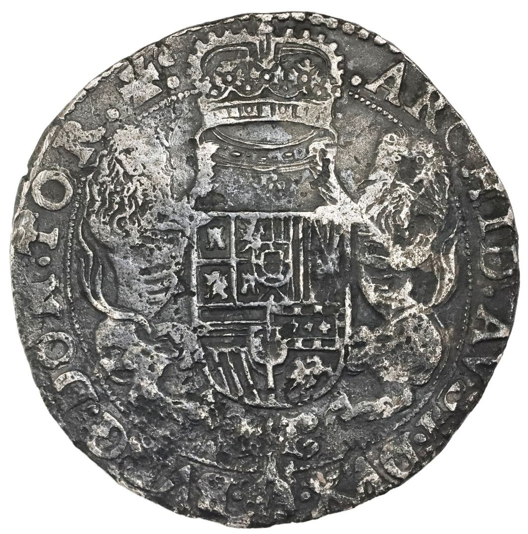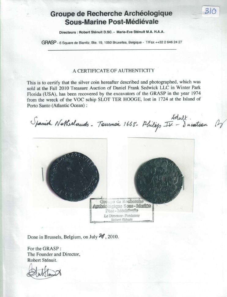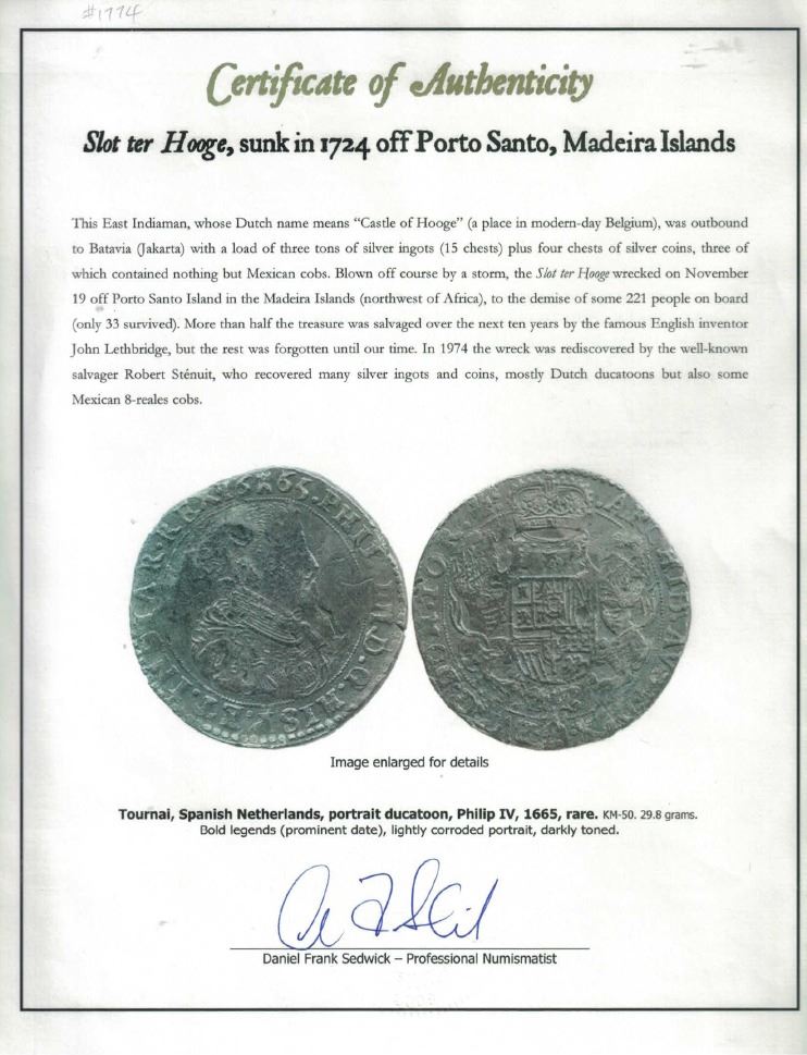 Tournai, Spanish Netherlands, portrait ducatoon, Philip IV, 1665, rare, ex-Jones. KM-52. 29.80 grams. Broad flan with full details despite light surface corrosion, very dark all over, rare final date of a scarce type and wreck. Pedigreed to the Dr. Peter Jones collection, with original photo-certificate from the salvor (Robert Stenuit, dated 2010) and Sedwick photo-certificate. Recovered from: Slot ter Hooge, sunk in 1724 off Porto Santo, Madeira Islands (northwest of Africa)