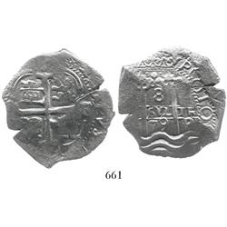 Potosi, Bolivia, cob 8 reales, 1680V. S-P39; KM-26; CT-361. 15.9 grams. Good full cross, parts of all 3 dates and king's name but moderately cor...